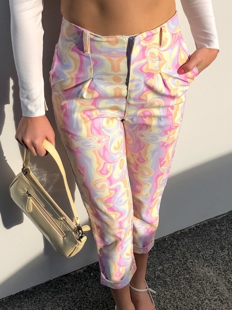 Feel like you’re back in the Swinging 60’s with these Angel Aura pants. Product Details & Fit Zip closure True to size Hemmed Cuff Belt Loops Product Measurements Size Small Length: 91.0cm Waist: 70.0cm Fabric & Care 100% Polyester, Heavy Weight Cold Machine Wash recommended